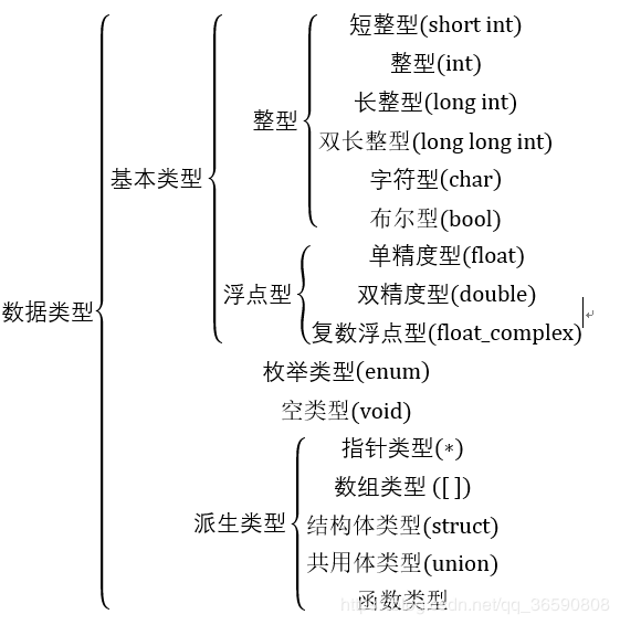 数据类型: int, float, char, double, void, short, long, _Bool, _Complex, _Imaginary, enum, struct, union